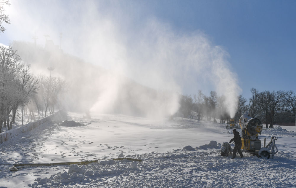 ↑在长春庙香山滑雪场,造雪机正在造雪(11月15日摄)。新华社记者 张楠 摄