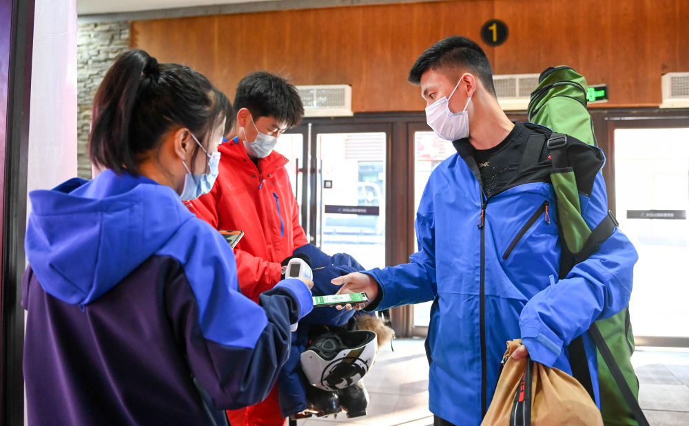 ↑滑雪爱好者在进入雪具大厅前扫码测温(11月15日摄)。新华社记者 颜麟蕴 摄