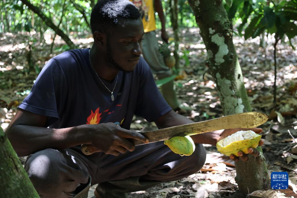 11月15日,在加纳东部省的一处可可种植园,一名种植户在切割可可果实。