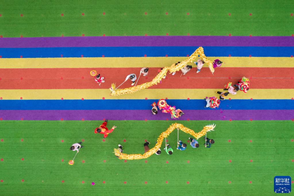 11月17日,在尧天坪镇幼儿园,孩子们在龙狮艺人的带领下进行龙狮训练(无人机照片)。新华社记者 陈思汗 摄