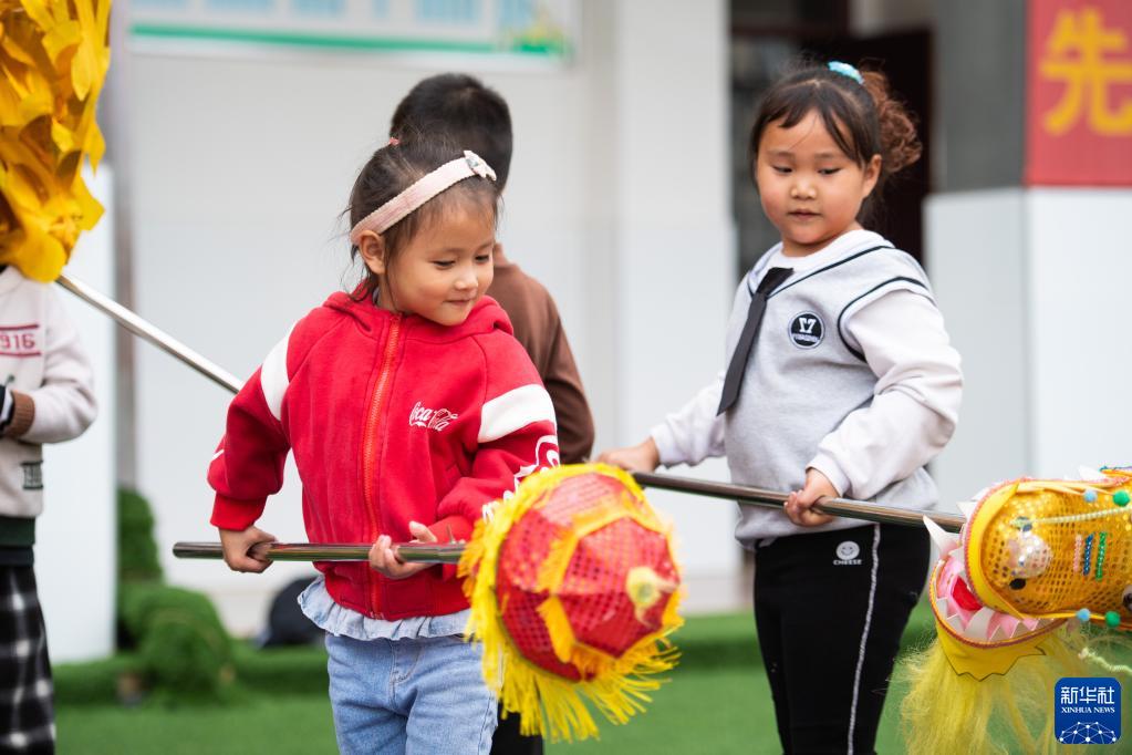 11月17日,在尧天坪镇幼儿园,学生在练习舞龙。新华社记者 陈思汗 摄