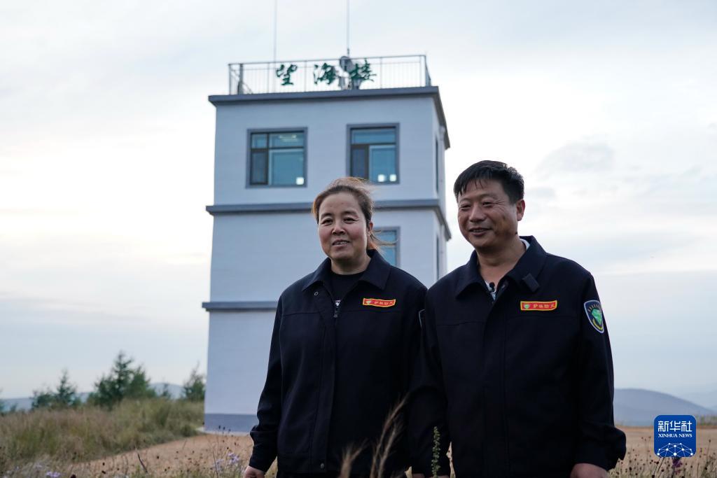 刘军(右)、王娟夫妇在塞罕坝机械林场月亮山望海楼外(8月23日摄)。新华社记者 牟宇 摄