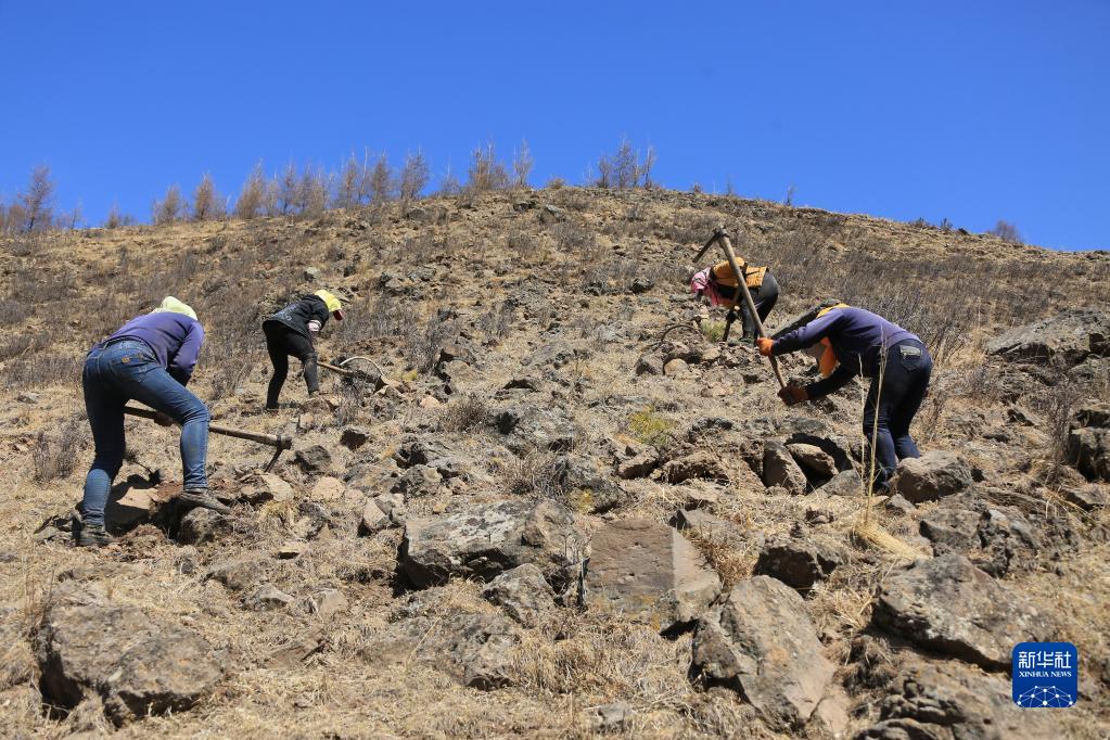 塞罕坝机械林场工人在石质阳坡上造林(2016年4月13日摄)。新华社发