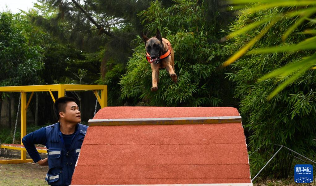 11月17日,“毛豆”在训导员的带领下进行障碍攀登训练。新华社记者 杨冠宇 摄