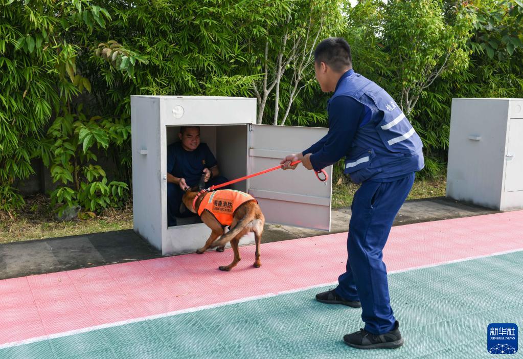 11月12日,“毛豆”在训导员的带领下进行箱体搜救训练。新华社记者 周佳谊 摄