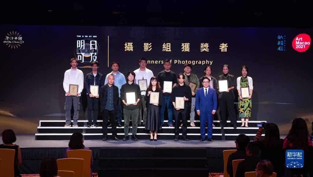 11月17日,“明日可及——2021大湾区青年艺术家计划”绘画及摄影竞赛颁奖典礼暨获奖作品展在澳门举行。这是嘉宾与摄影组获奖者合影。新华社记者 张金加 摄