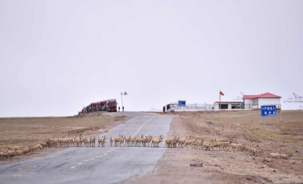 在青海可可西里,一群雌性待产藏羚羊正在通过青藏公路(2016年6月7日摄)。新华社记者吴刚摄