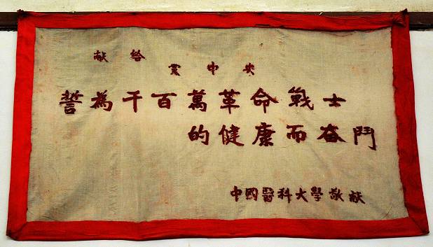 1945年,中国医科大学师生为中共七大制作的锦旗悬挂于七大会场,现存于延安历史博物馆。(中国医科大学供图)