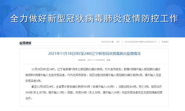 11月18日0时至24时,辽宁省新增7例本土新冠肺炎确诊病例,为大连市报告;新增1例境外输入新冠肺炎确诊病例和5例境外输入无症状感染者,均为沈阳市报告。当日治愈出院境外输入新冠肺炎确诊病例1例、境外输入无症状感染者5例。