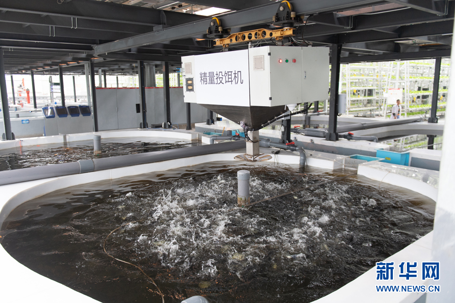 鱼菜共生AI工厂内,通过精量投饵机,实现了鱼饵料精准投喂。新华网 耿骏宇 摄