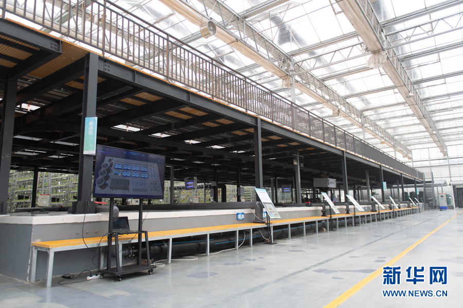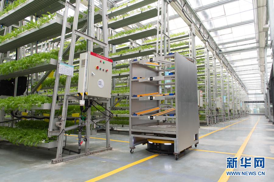 鱼菜共生AI工厂内,温室作业机器人正在进行上下架作业。新华网 耿骏宇 摄