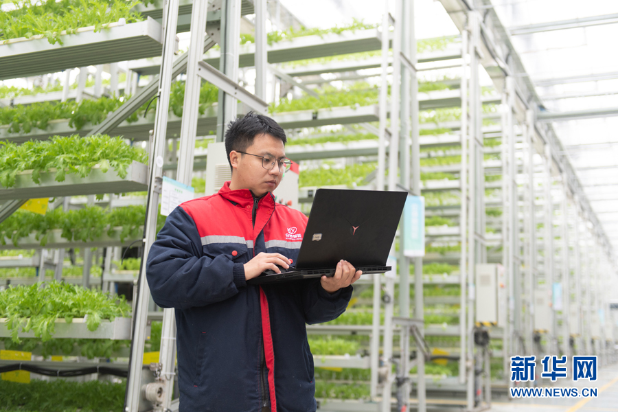在鱼菜共生AI工厂内,蔬菜栽培采用了智能化立体式栽培技术,蔬菜就像住进了“楼房”。新华网 耿骏宇 摄