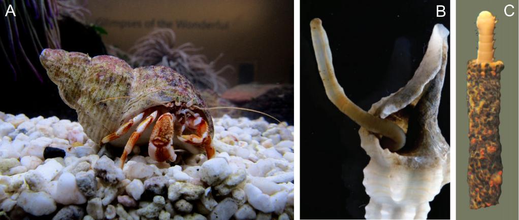 有寄居行为的动物类群。A为寄居蟹,B为腹足动物壳体中的倭革囊星虫,C为有孔虫壳管中的福氏虫科环节动物。(云南大学供图)