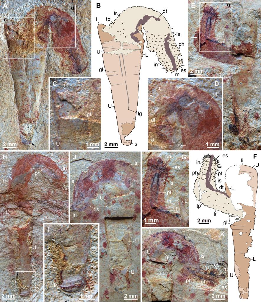 云南大学研究团队共采集到4枚寒武纪鳃曳类蠕虫化石标本。研究人员在显微镜下观察标本时发现:每个个体的后部均掩藏在软舌螺体壳中,且虫体直径略小于软舌螺体管,这表明该蠕虫是在有意识地挑选软舌螺空管并“隐居”其中,以躲避捕食者。这一发现首次证实了鳃曳动物的寄居行为。