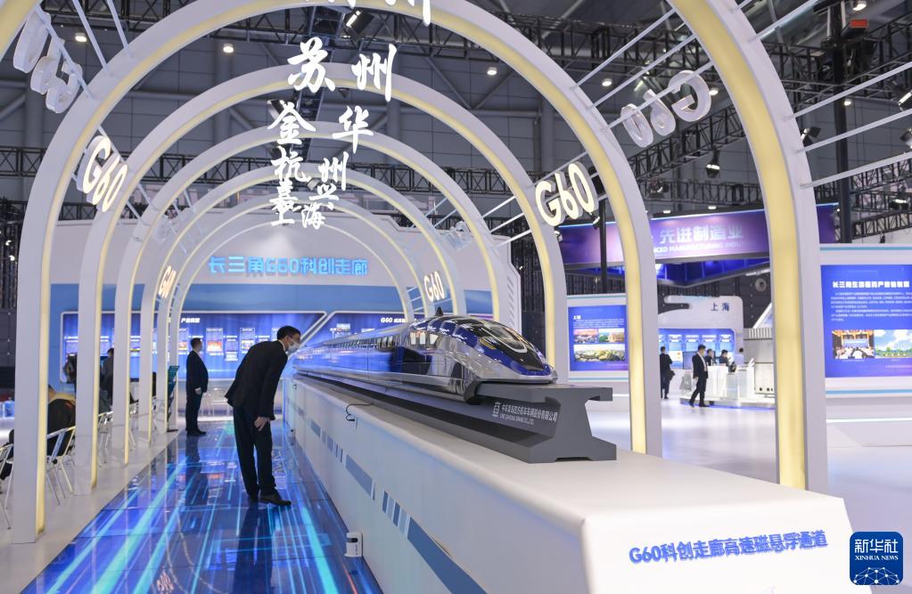 11月19日,观众在2021世界制造业大会上观看高速磁悬浮列车模型。新华社记者 韩旭 摄