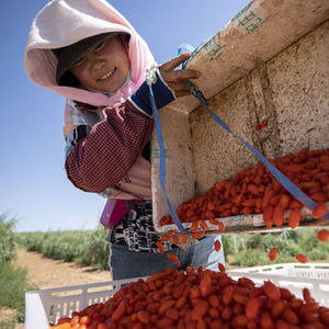 7月1日,在宁夏中宁县玺赞生态枸杞庄园,采摘工准备将采摘的枸杞称重。新华社记者 杨植森 摄