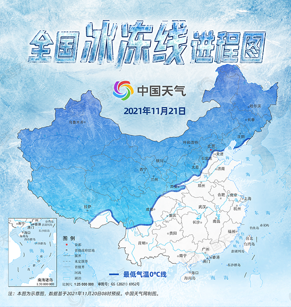 从中国天气推出的全国冰冻线进程图可以看到,今起三天,冰冻线将不断向南推进。具体来看,11月21日早晨,最低气温0℃线最前端将抵达华北中南部及四川北部一带,北方大部地区的最高气温将降至冰点或以下。城市中,乌鲁木齐、西宁及哈尔滨等地最低气温将降至-10℃以下,哈尔滨是今年首次跌破-10℃,北京明早气温也将在冰点左右。