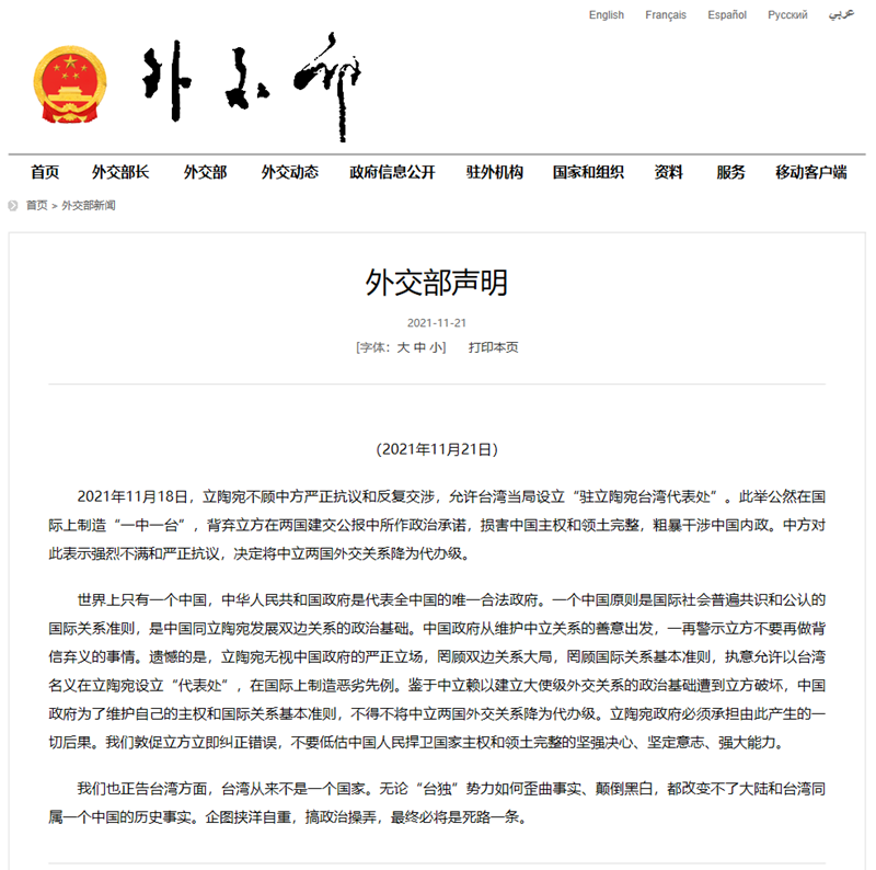 2021年11月18日,立陶宛不顾中方严正抗议和反复交涉,允许台湾当局设立“驻立陶宛台湾代表处”。此举公然在国际上制造“一中一台”,背弃立方在两国建交公报中所作政治承诺,损害中国主权和领土完整,粗暴干涉中国内政。中方对此表示强烈不满和严正抗议,决定将中立两国外交关系降为代办级。