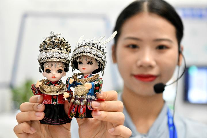 9月24日,在2021中国—东盟教育交流周展示馆,参会人员展示学生制作的民族文化产品。(新华社记者杨文斌摄)