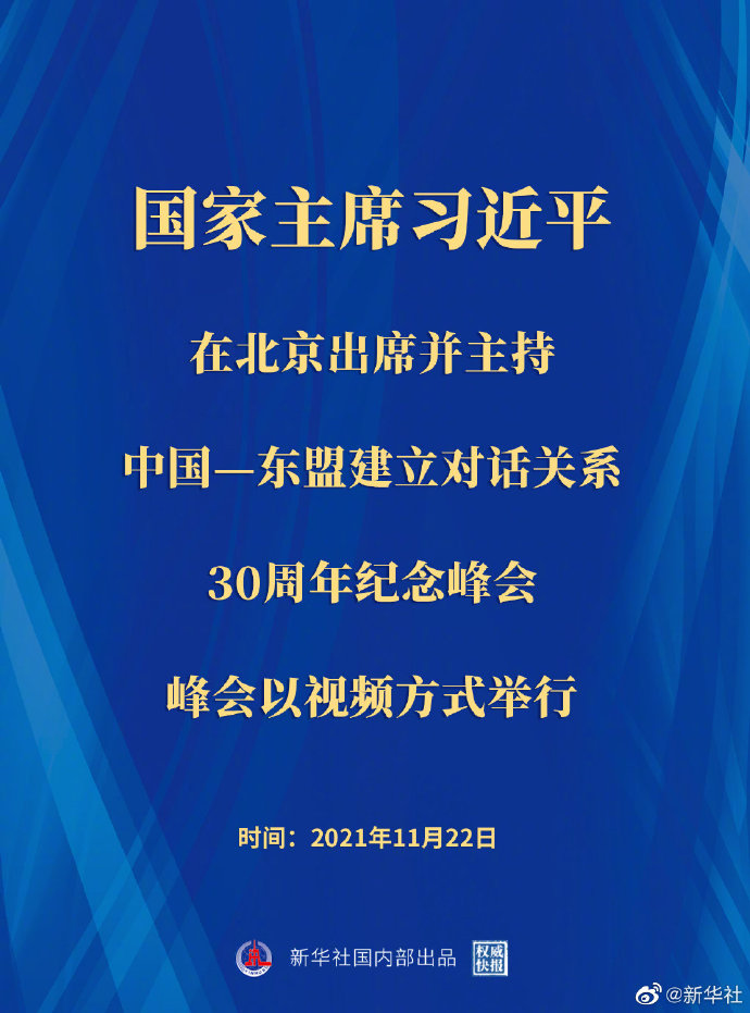 11月22日,国家主席习近平在北京出席并主持中国—东盟建立对话关系30周年纪念峰会。峰会以视频方式举行。