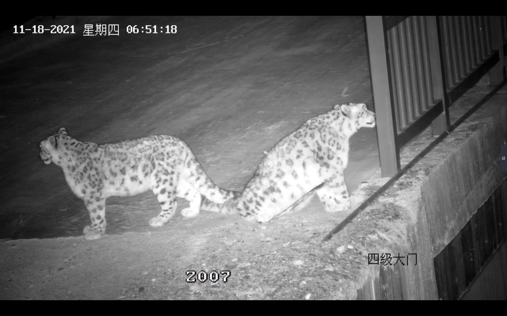 新华社兰州11月22日电(记者王博)近日,甘肃省肃南裕固族自治县境内一水电站的监控摄像头记录了一段特殊的“值班日志”:两只雪豹清晨来访。虽然在近几年,这已不是人类和雪豹在祁连山区的首次“近距离接触”,但雪豹在人类活动区域逗留的情形仍十分罕见。