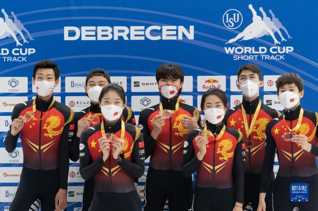 11月21日,获得冠军的中国队在2000米混合接力颁奖仪式上。当日,在匈牙利德布勒森举行的国际滑联短道速滑世界杯匈牙利站2000米混合接力决赛中,中国队以2分39秒386的成绩获得冠军。新华社发(弗尔季·奥蒂洛摄)