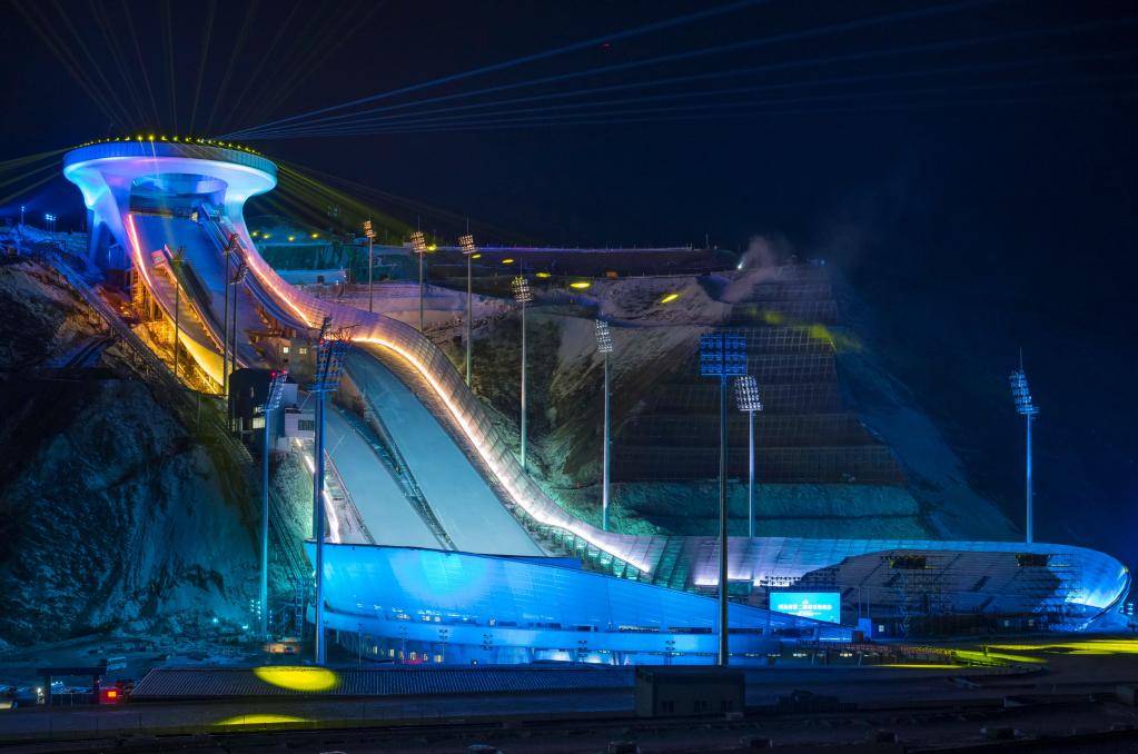 位于河北省张家口市崇礼区的国家跳台滑雪中心“雪如意”点亮效果(无人机照片)。新华社发