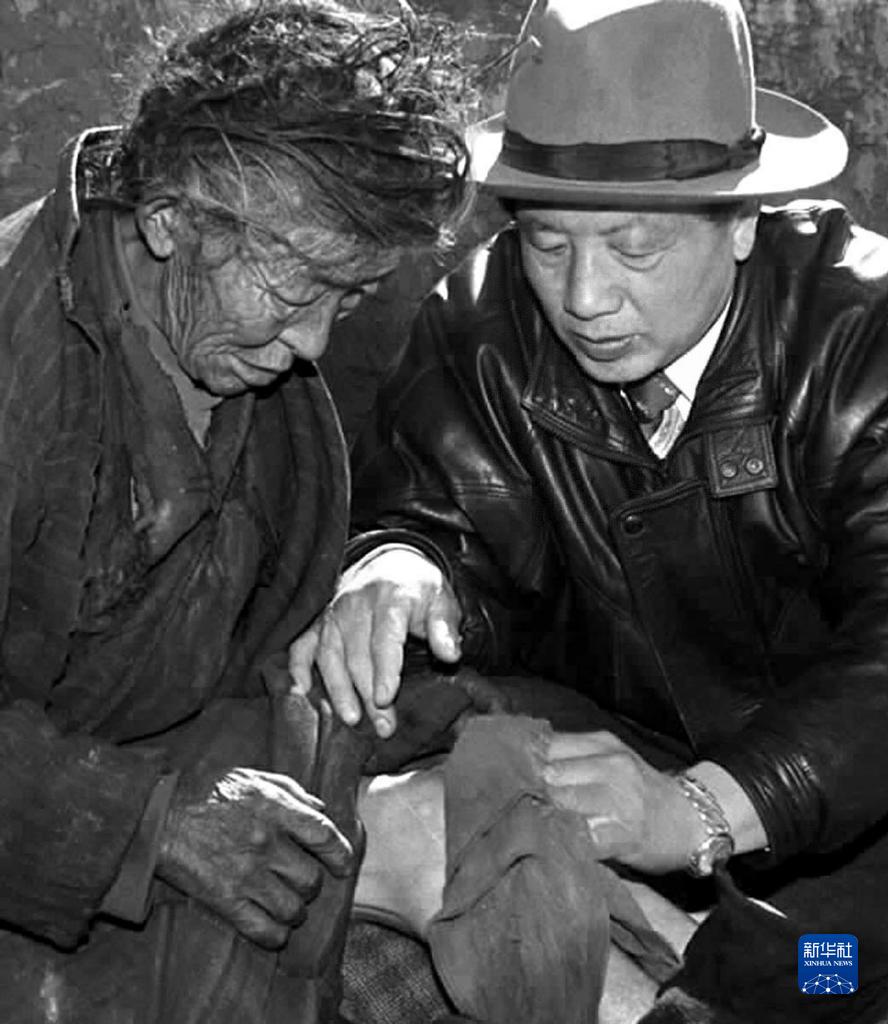 孔繁森(右)在西藏阿里日土县过巴乡看望孤寡老人益西卓玛(资料照片)。新华社发