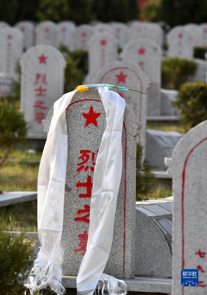 在西藏拉萨烈士陵园,一条洁白的哈达挂在烈士墓碑上(4月4日摄)。新华社记者 觉果 摄