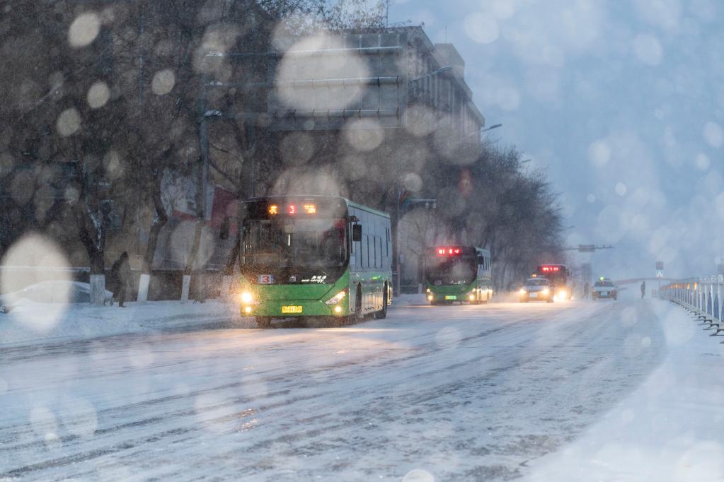 11月22日,公交车行驶在暴雪中的黑龙江省鹤岗市街头。新华社记者 谢剑飞 摄
