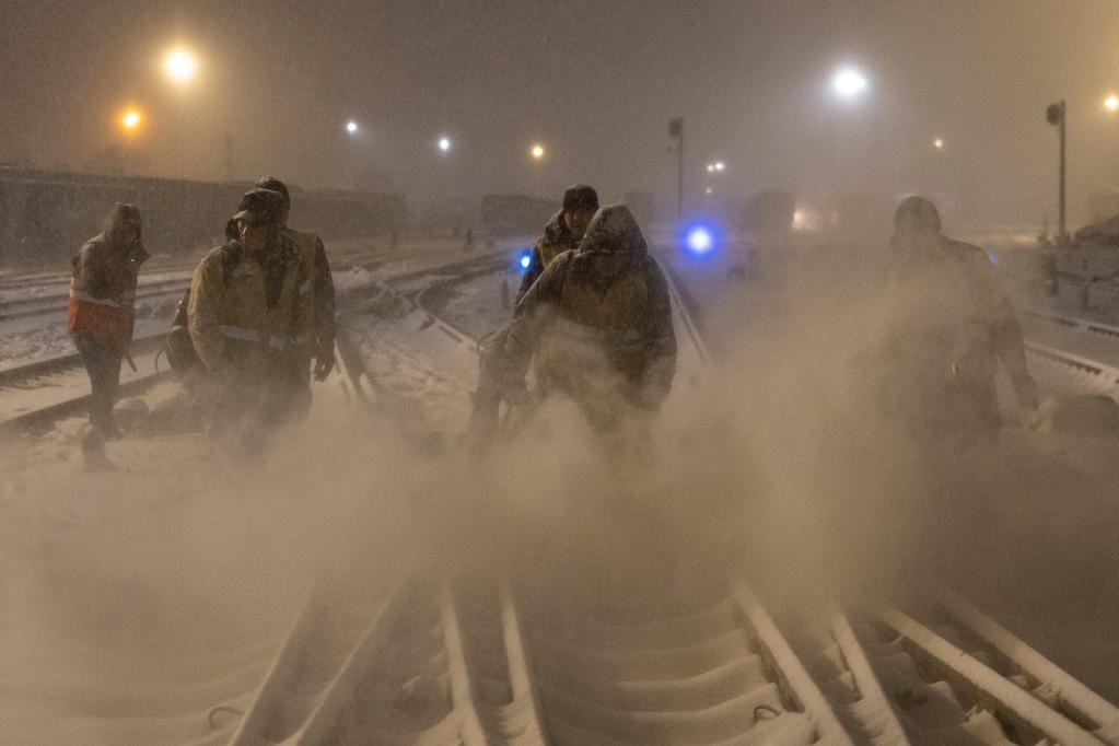 11月22日凌晨,在鸡西火车站,工作人员在清雪。新华社记者 张涛 摄