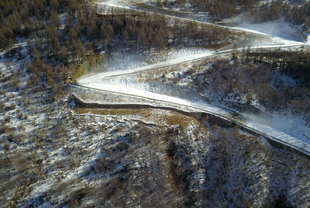 11月16日,正在造雪中的国家高山滑雪中心雪道(无人机照片)。新华社记者 张晨霖 摄