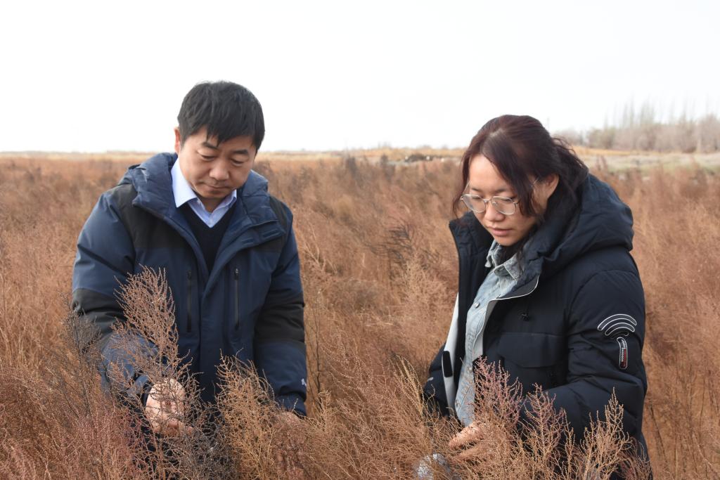 中科院新疆生地所正高级工程师赵振勇(左)正带领学生在试验田中采集盐地碱蓬的种子。新华社记者 张晓龙 摄