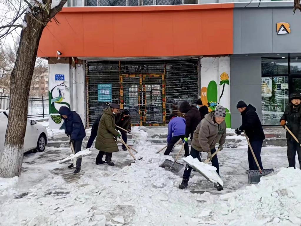 在佳木斯市市区,经营商户们正在清雪。(受访者供图)