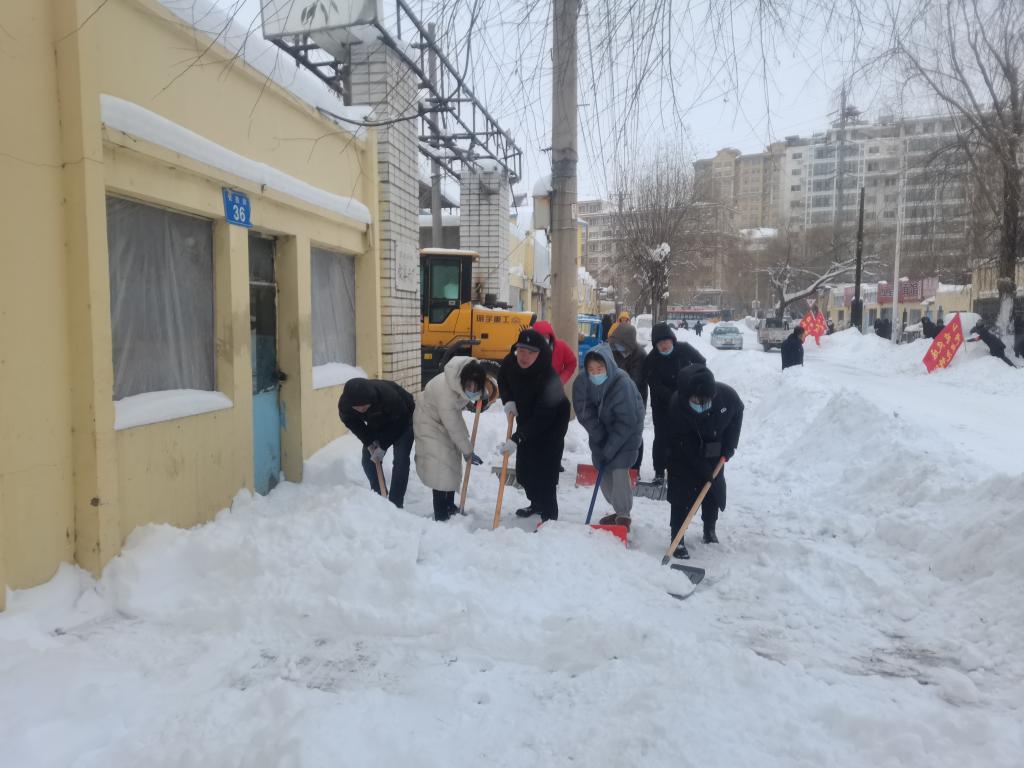 22日,佳木斯市2200余名党员干部分布在各自责任区,铲雪、除冰,清扫出一条条安全通道。