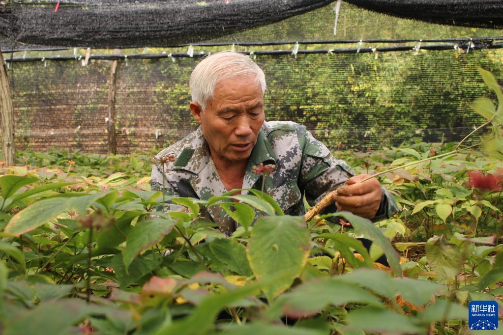 山东威海文登退役军人王文水在种植基地查看西洋参苗的生长情况(9月1日摄)。新华社发