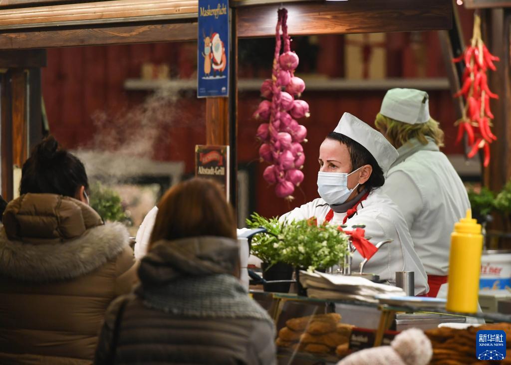 11月22日,在德国法兰克福“圣诞市场”,戴口罩的工作人员为顾客服务。(新华社记者 逯阳 摄)