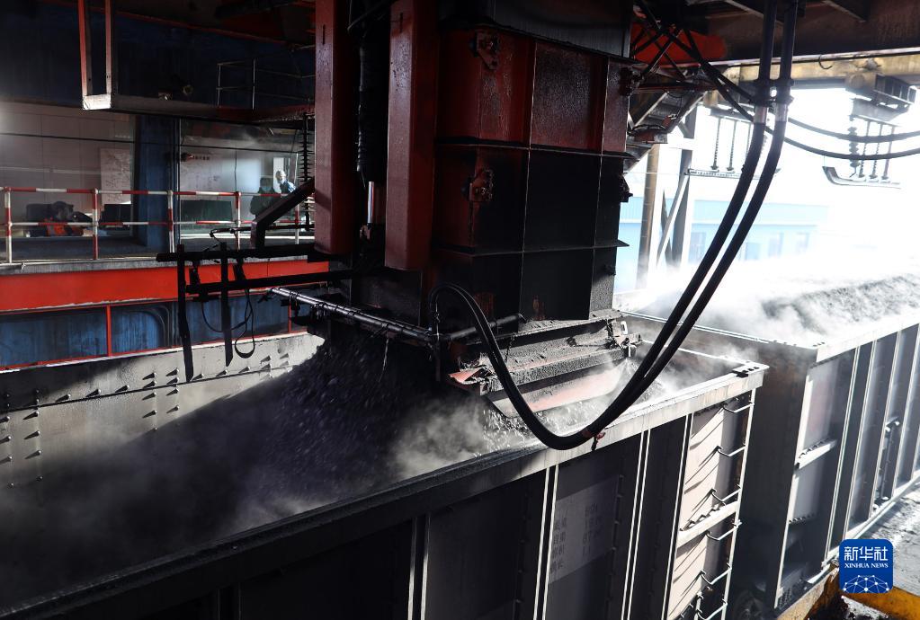 11月16日,国家能源神东煤炭集团大柳塔煤矿的机械设备在往运煤列车装煤。新华社记者 贾立君 摄