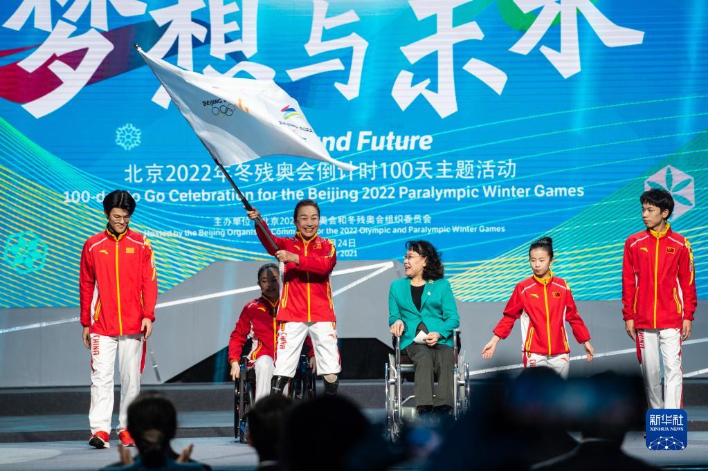 新华社北京11月24日电 北京2022年冬残奥会倒计时100天主题活动24日晚在国家游泳中心“冰立方”举行,中国残联主席、中国残奥委会主席、北京冬奥组委执行主席张海迪在活动中为五名残疾人志愿者代表授旗。