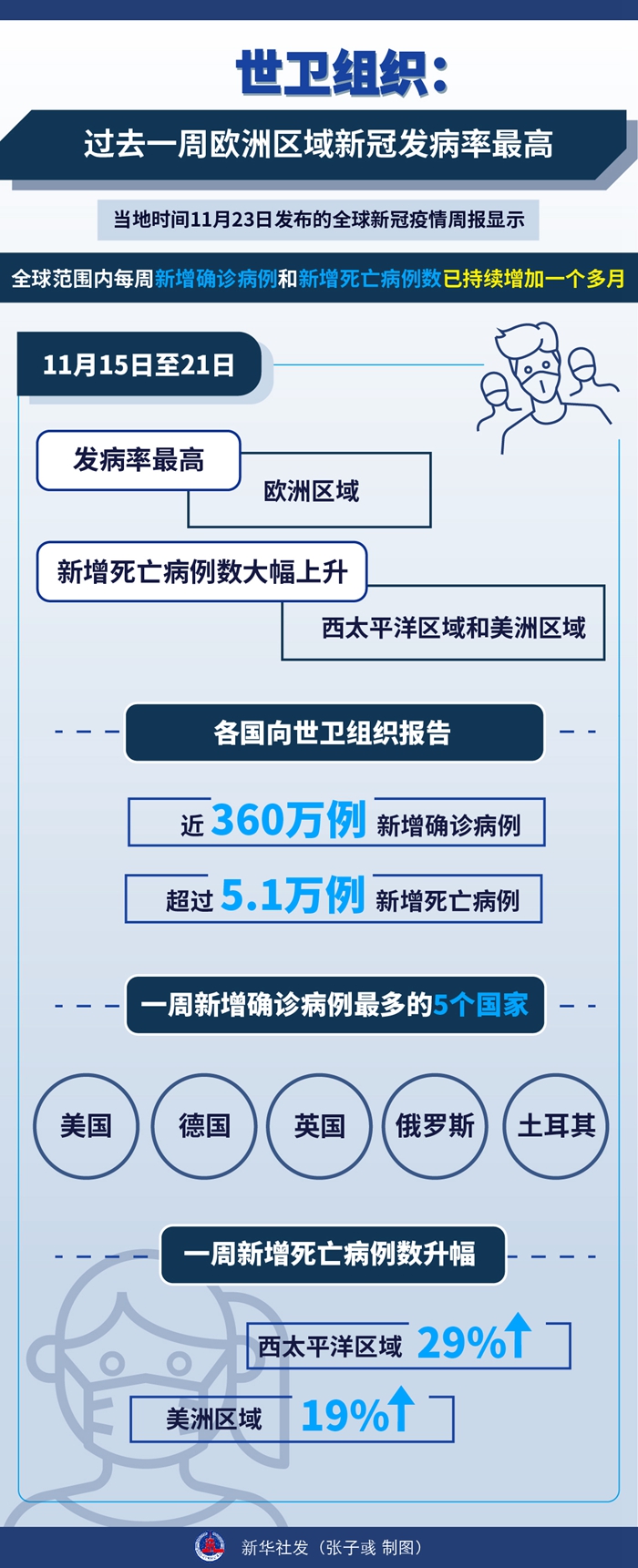 周报显示,11月15日至21日,各国向世卫组织报告近360万例新增确诊病例和超过5.1万例新增死亡病例,这两项数据与前一周相比增幅均为6%。一周新增确诊病例最多的5个国家分别是美国、德国、英国、俄罗斯和土耳其。