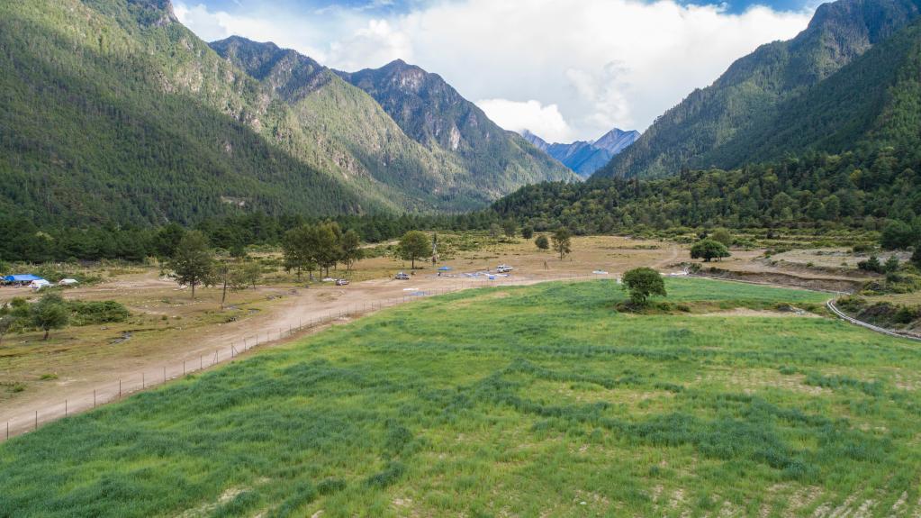 西藏林芝市米林县,“绿哈达行动”中种植的人工草场郁郁葱葱(2020年9月13日摄,无人机照片)。 新华社记者孙非 摄