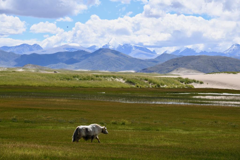 西藏日喀则市仲巴县境内雅鲁藏布江发源地附近,一头牦牛行走在草地上(2018年9月12日摄)。 新华社记者普布扎西 摄