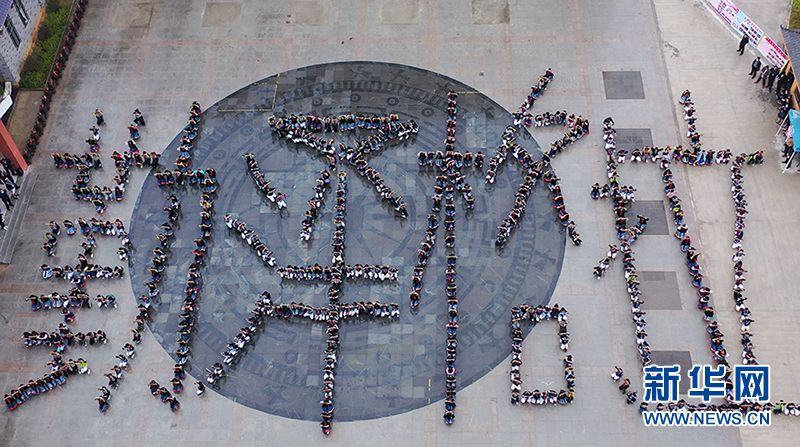 无人机航拍白裤瑶群众表演传统舞蹈“南丹勤泽格拉”。新华网 刘君 摄