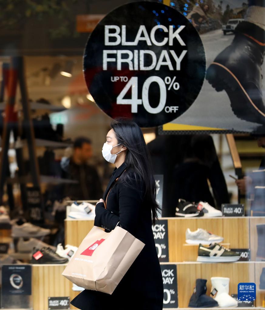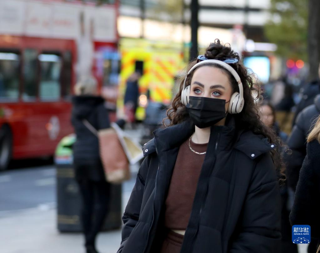 11月25日,一名女子在英国伦敦佩戴口罩出行。新华社记者 李颖 摄