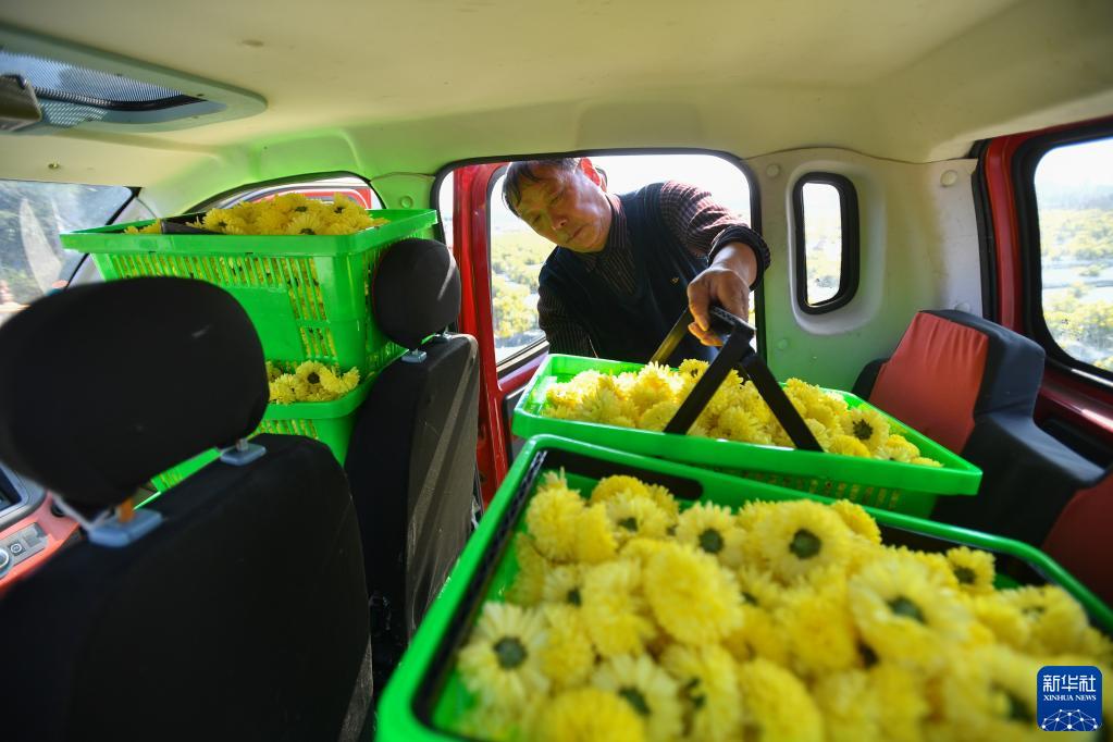 11月26日,在长沙市望城区靖港镇福塘村,村民将刚采收的皇菊装车。