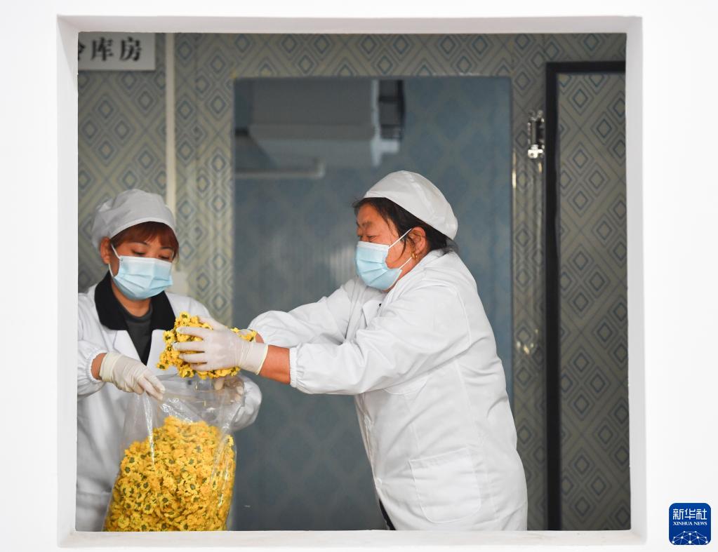 11月26日,在长沙市望城区靖港镇福塘村,村民在加工车间将皇菊打包。