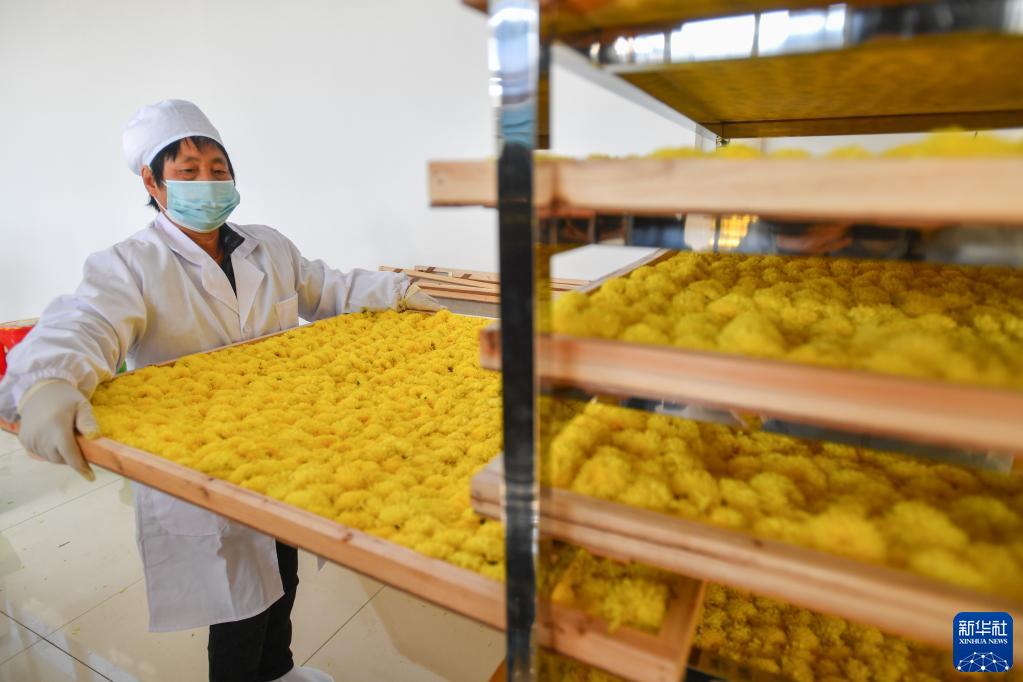 11月26日,在长沙市望城区靖港镇福塘村,村民在加工车间整理已分拣的皇菊。