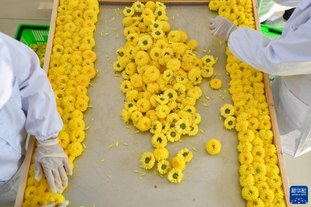 11月26日,在长沙市望城区靖港镇福塘村,村民在加工车间分拣皇菊。