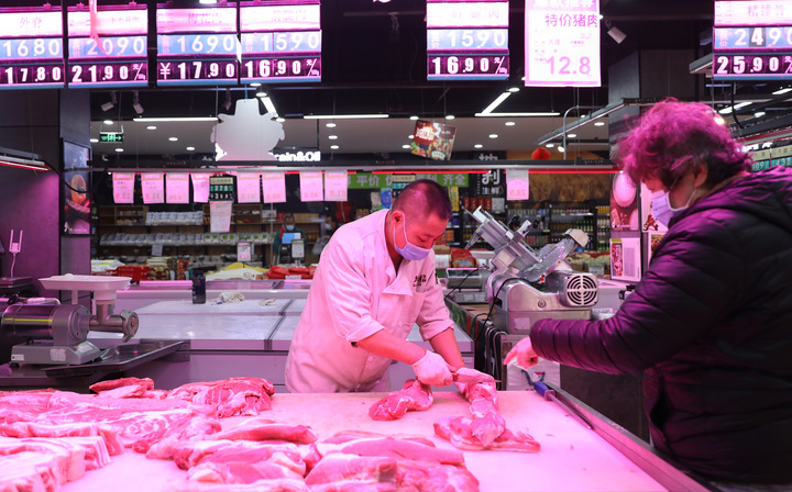 11月18日,辽宁大连一家生鲜超市的售货人员为顾客切分肉品。新华社记者 姚剑锋 摄