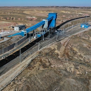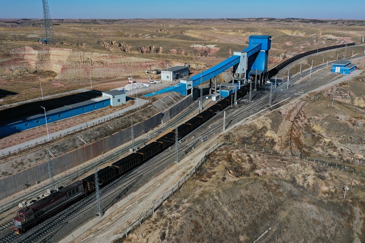 这是11月23日在位于鄂尔多斯市的淮河能源西部煤电集团色连二矿罕台川集装站拍摄的正在装煤的列车(无人机照片)。新华社记者 李志鹏 摄